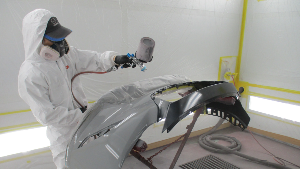 マツダのツナギを着て、塗装されたアクリル板をツヤが出るまで磨いてみよう!